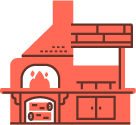 Барбекю с тремя уровнями расположения решетки и прорезями для вертела, ограничительные кирпичи для углей, выдвижной зольник. Рабочая поверхность окрашена в красный цвет.