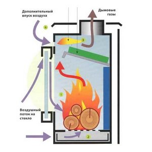 Все это происходит при высокой температуре и сопровождается значительной выработкой тепла. Когда печь разжигают, в очаг поступает воздух из помещения, где расположена печь. Этот начальный воздух проходит через особые отверстия, которые регулируются, а несгоревшие частицы топлива и дым идут вверх и выводятся с помощью дефлектора через дымоход.