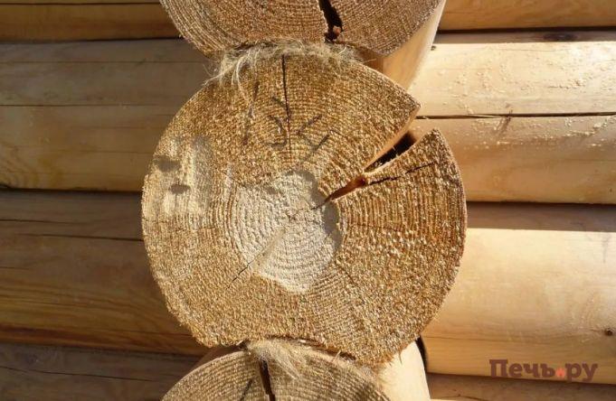 Минусом считают появление трещин. С улицы материал сохнет довольно быстро, что нельзя сказать о бревне внутри помещения. Материал становиться сырым внутри и сухим снаружи. Это приводит к трещинам от разрыва волокон. Если усадка проходит быстро, то на бревне появится большое количество трещин.