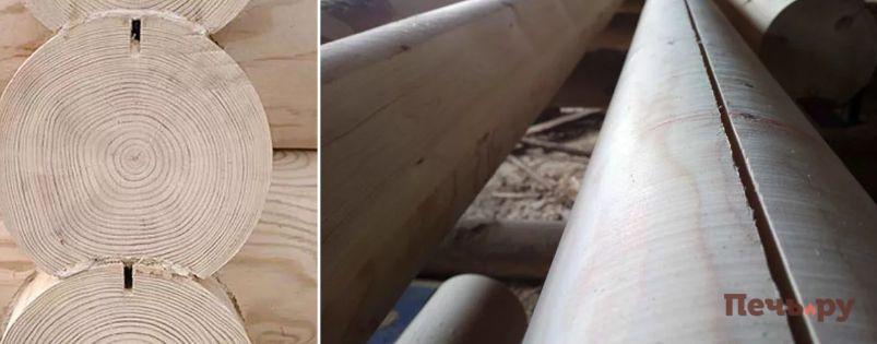Для снижения деформации дома необходимо использовать компенсаторы. Они представляют собой компенсационные пропилы, снимающие напряжение древесных волокон. Проделывают их на глубину до 10 мм. Собирая сруб, необходимо уложить его пропилом вверх. Таким образом, влага не проникнет в древесину.