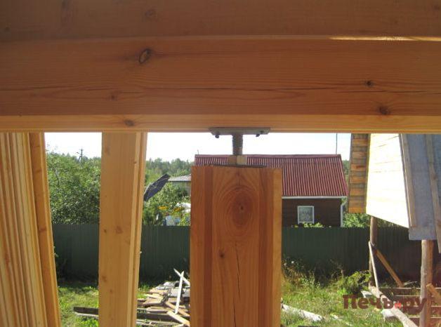 Чтобы избежать повреждения кровли, необходимо использовать домкрат. С его помощью поддерживаются и регулируются опоры. Дело в том, что колонны и столбы не подвергаются усадке, что может привести к проблемам со строением. Для этого домкрат монтируют в зазор вверху дверного проема.
